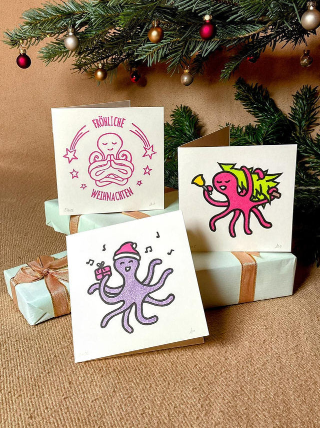 🐙 Octi mit Tanne, Octi mit Geschenk und Frohe Weihnachten - drei handgedruckte Klappkarten im Format 10x10cm mit Umschlag