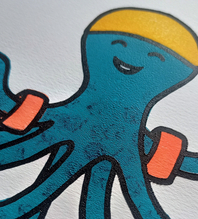 Linoldruck "Kalypso" Octopus mit Schwimmflügeln 30x30cm