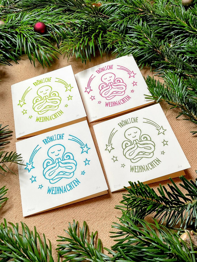 Fröhliche Weihnachten - handgedruckte Klappkarte im Format 10x10cm mit Umschlag