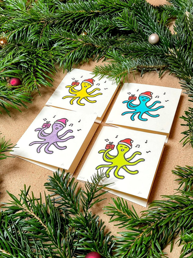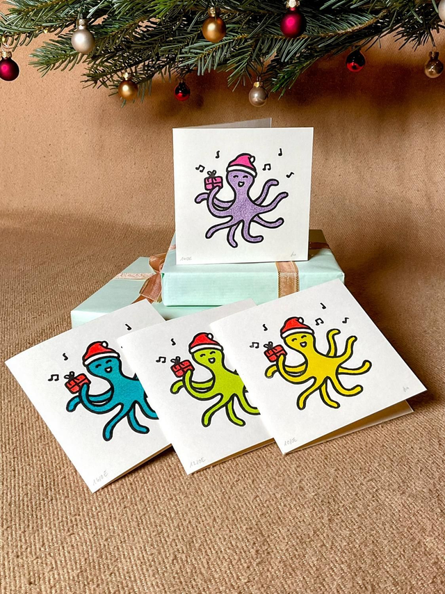 Octi mit Geschenk - handgedruckte Klappkarte im Format 10x10cm mit Umschlag