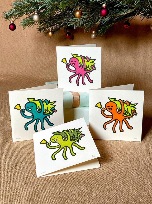 Octi mit Tanne - handgedruckte Klappkarte im Format 10x10cm mit Umschlag